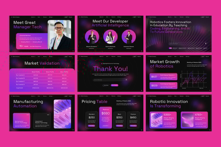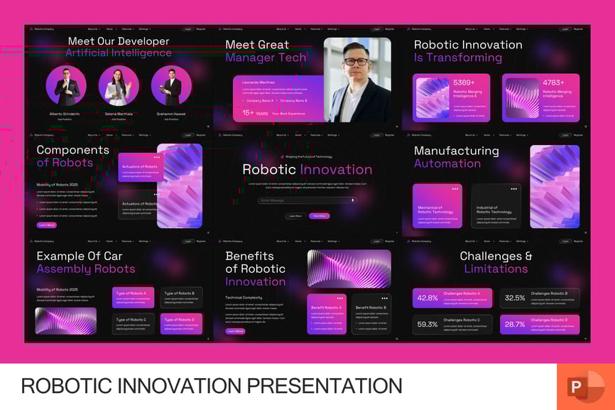 机器人创新 PowerPoint 演示文稿模板是一款现代专业的幻灯片,旨在展示尖端技术、机器人研究、自动化系统和未来创新。该模板非常适合初创公司、科技公司、工程师、研究人员和商务人士,它将流畅的布局与高科技视觉效果相结合,让您的演示文稿更具影响力和吸引力。凭借独特的幻灯片、可自定义的信息图表、图表、设备模型和未来主义的设计元素,您可以轻松展示关于人工智能、机器人、自动化、机器学习和工业技术的想法。每张幻灯片都经过精心设计,清晰地突出您的概念,确保您的观众保持专注并留下深刻印象。