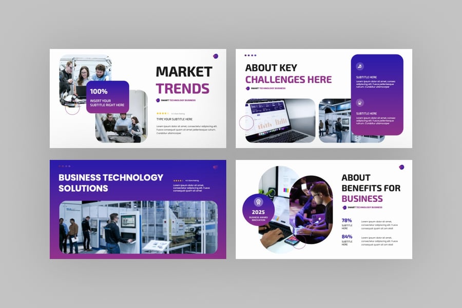 这款专业且充满未来感的模板,助您打造极具影响力的技术演示。它采用现代布局和简洁的视觉效果,可帮助您清晰地解释复杂概念、展示创新成果或推介前沿解决方案。非常适合初创公司、IT 公司或技术驱动型项目。