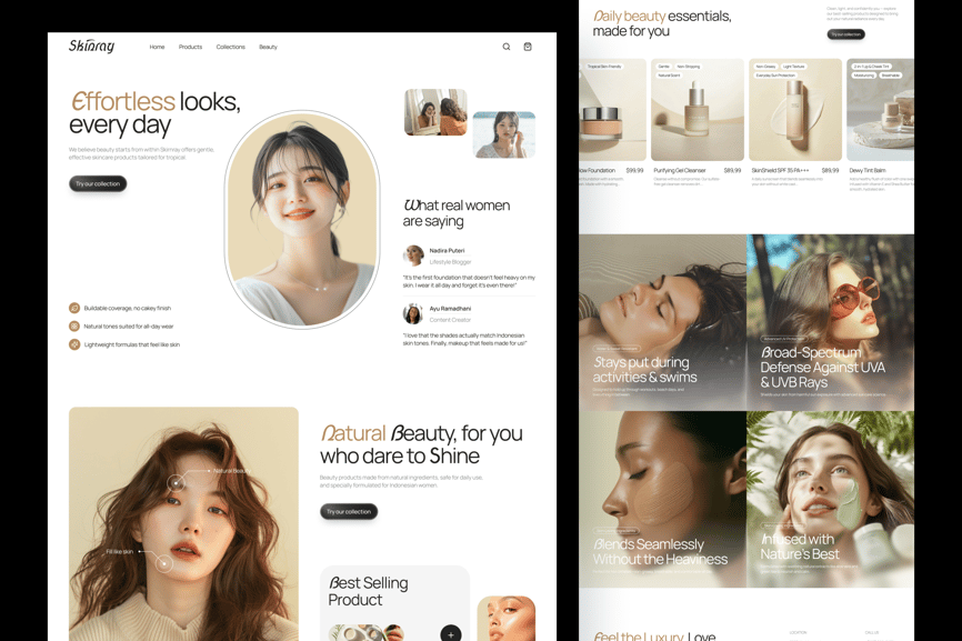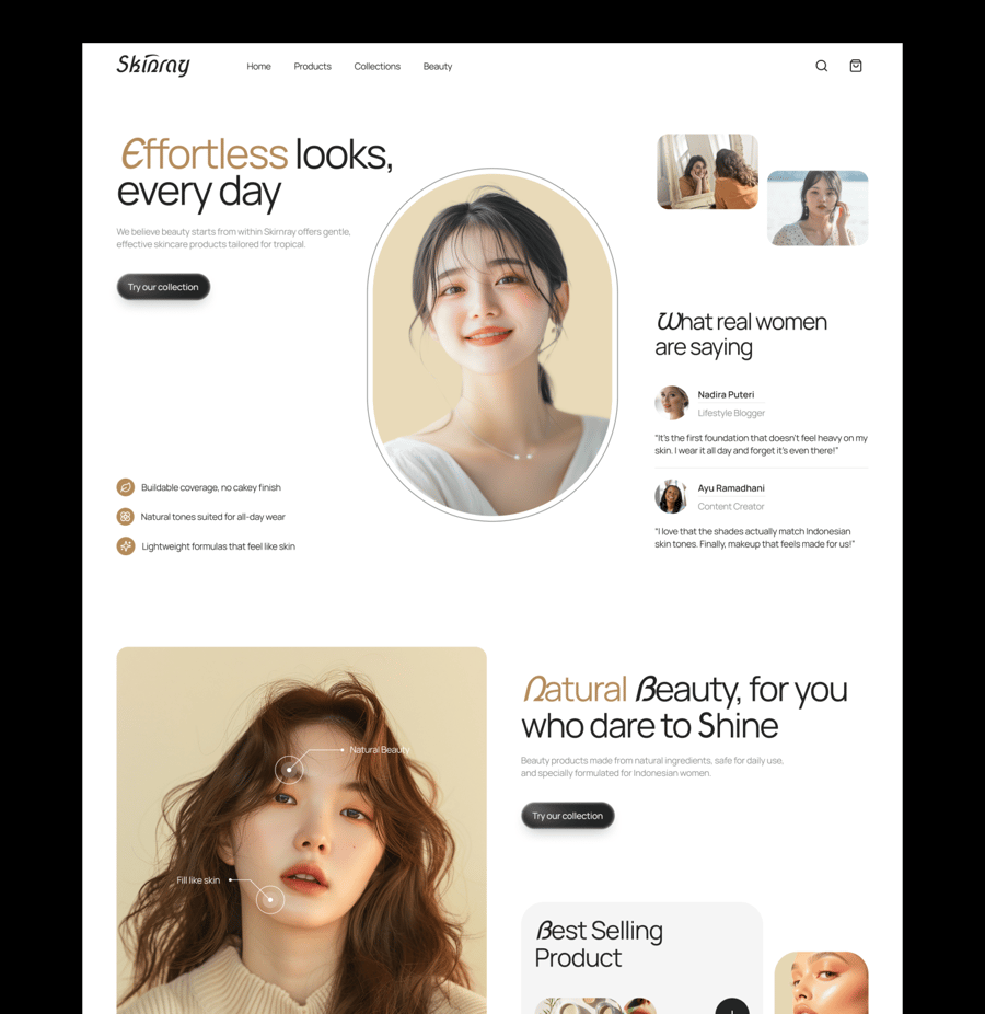 Skinray 是一款护肤品电商网站落地页 UI 套件。落地页包含 5 个部分,分别是:主打产品、畅销产品、试用系列、功能介绍和页脚。