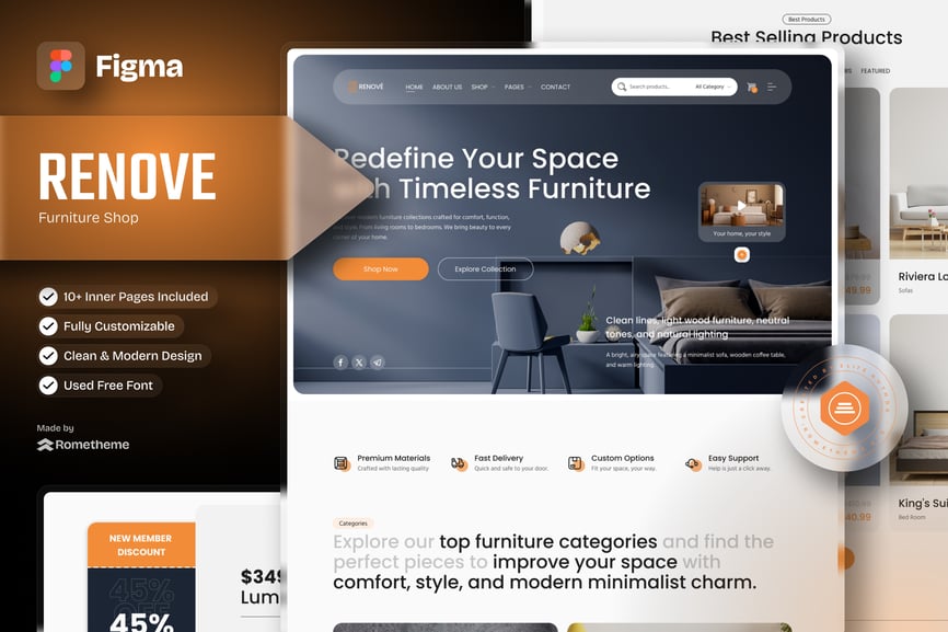 RENOVÉ 是一款专业设计的 Figma 模板,专为现代家具电商商店打造。无论您销售的是沙发、卧室套装、装饰品还是灯具,RENOVÉ 都能为您提供所有必要的组件,让您美观有效地展示产品。它拥有简洁、优雅且完全可定制的布局,可帮助您提供优质的购物体验。其用户友好的设计确保了设计师和开发人员的流畅工作流程,使其成为打造时尚、高转化率的 WooCommerce 家具商店的理想选择。
