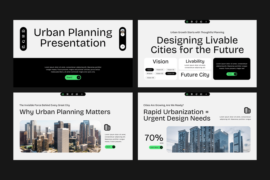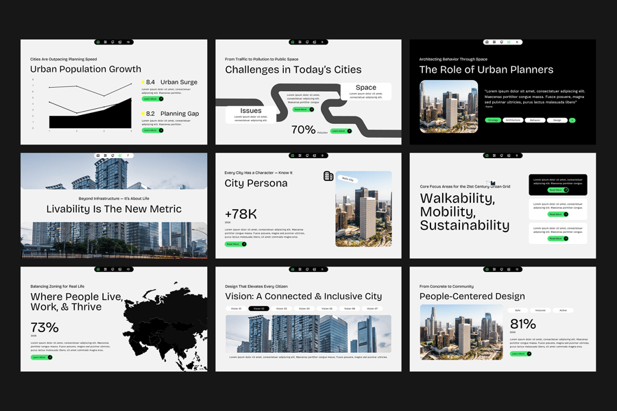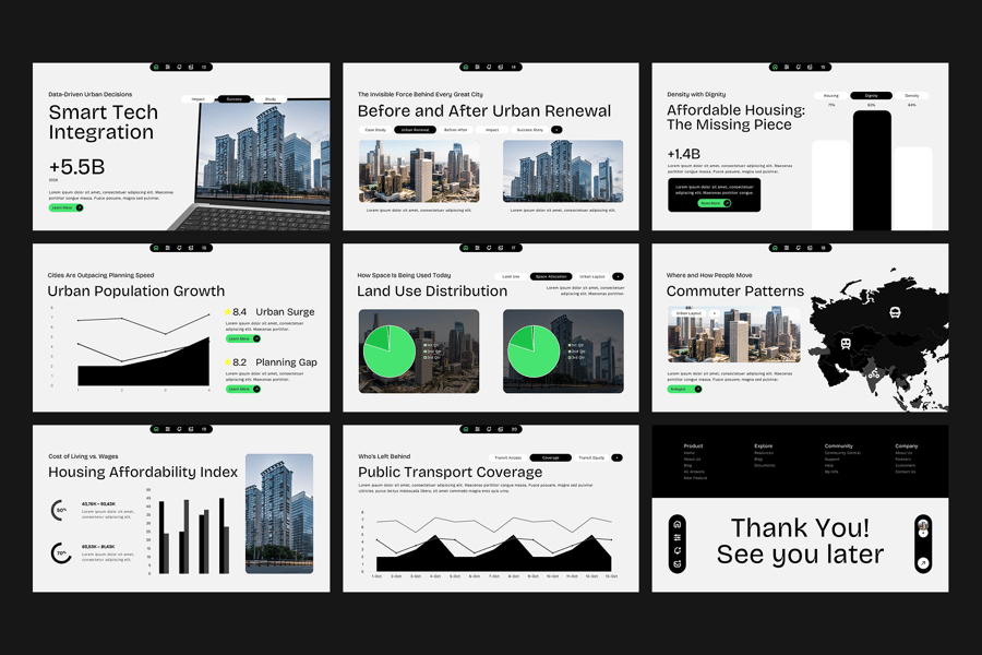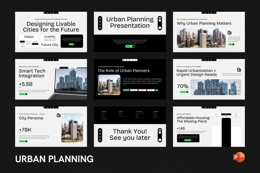 使用城市规划 PowerPoint 演示文稿模板塑造城市的未来——这是一款时尚、现代且完全可定制的演示文稿解决方案,适用于建筑师、城市规划师、房地产开发商和政府机构。该模板旨在以专业的清晰度展示城市发展项目、基础设施提案、分区规划、智慧城市概念和可持续设计策略。该演示文稿模板包含 20 多张独特的幻灯片、可编辑的信息图表、母版幻灯片和图片占位符,确保您的城市规划理念能够有效且直观地传达。