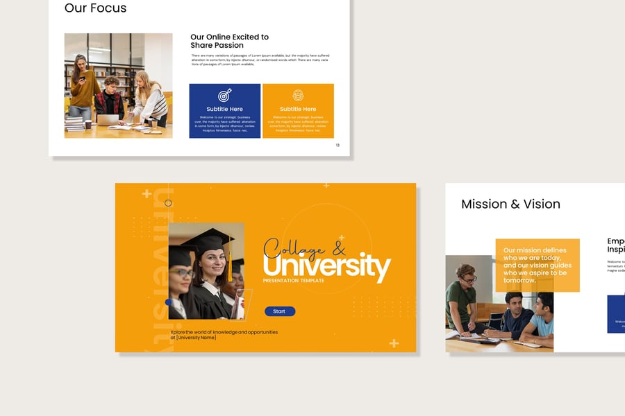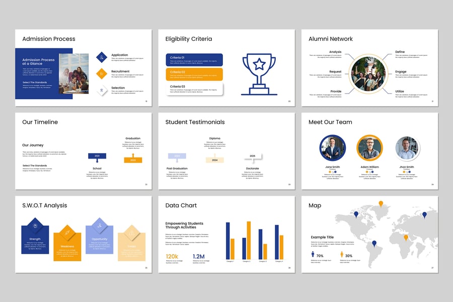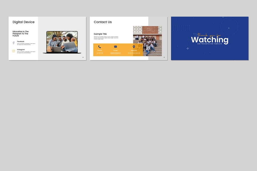 使用大学及学院演示文稿模板,以专业简洁的方式展示您的作品。这款模板设计简洁现代,功能强大,包含创意照片布局、信息图表、表格、矢量图标、图表以及大量实用功能,可将您的作品和公司简介提升到一个新的高度。