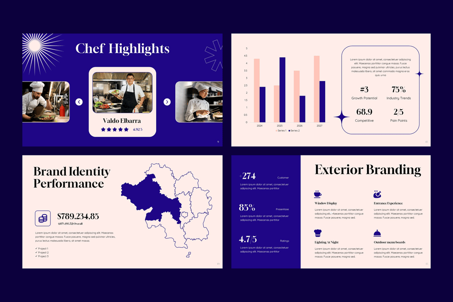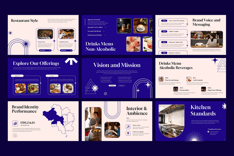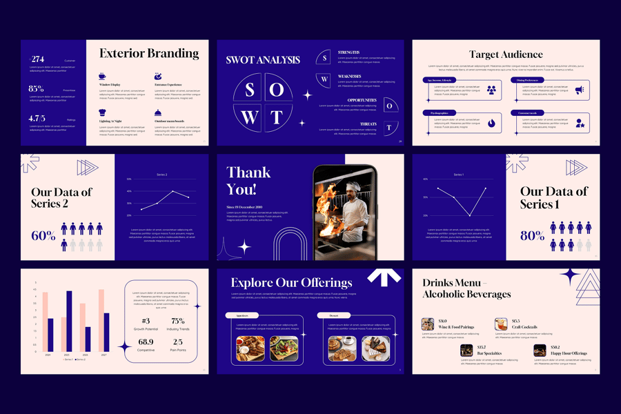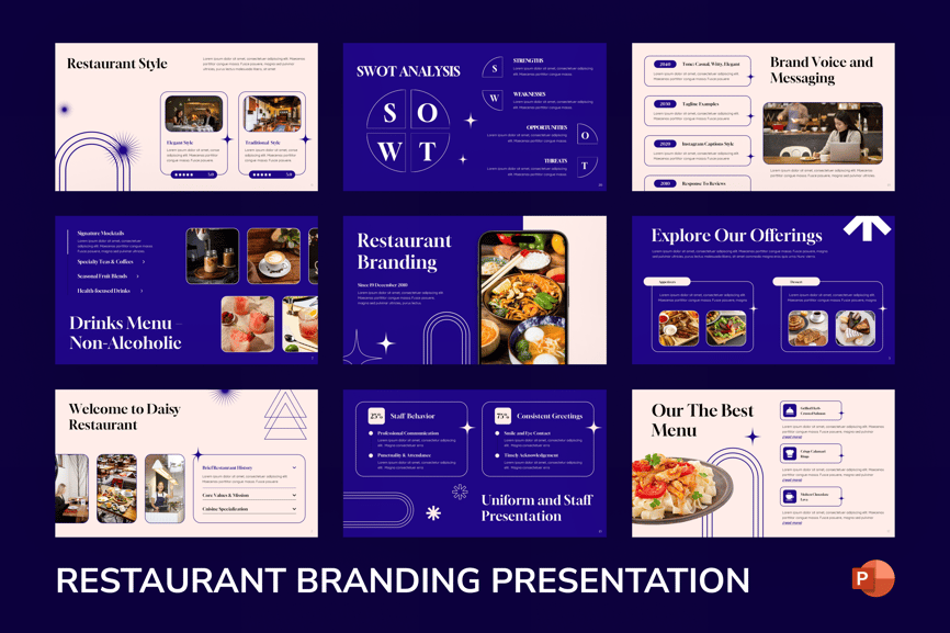 使用我们的餐厅品牌 PowerPoint 演示模板提升您餐厅的视觉形象——这款时尚、现代且完全可定制的演示文稿专为餐饮企业、咖啡馆、小酒馆和食品创业者设计。这款演示模板非常适合展示您的品牌故事、菜单概念、室内设计、客户体验、营销策略等。该模板精心制作,创意十足,包含 30 多张独特的幻灯片,布局简洁,信息图表可编辑,食物主题图标以及专业排版。