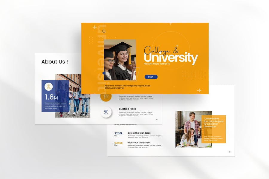使用大学及学院演示文稿模板,以专业简洁的方式展示您的作品。这款模板设计简洁现代,功能强大,包含创意照片布局、信息图表、表格、矢量图标、图表以及大量实用功能,可将您的作品和公司简介提升到一个新的高度。