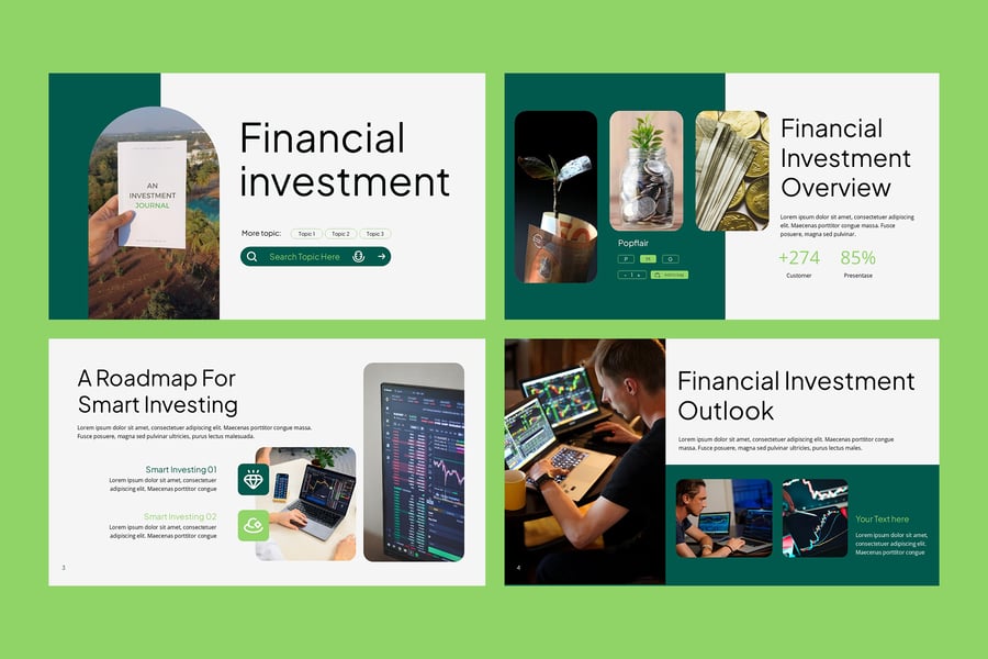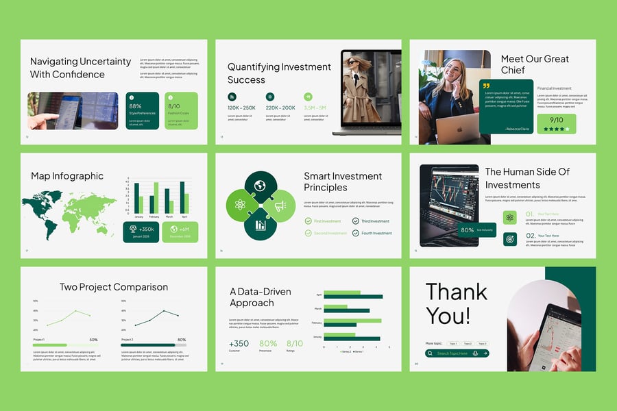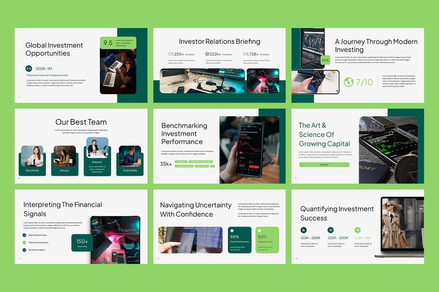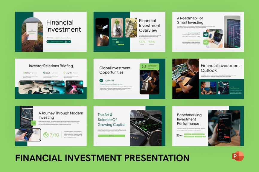 使用金融投资 PowerPoint 演示文稿模板,最大限度地提升您的财务影响力。这是一款专为金融专家、投资公司、业务分析师和企业演示者设计的现代、简洁、专业的模板。无论您是向投资者推介、展示季度业绩,还是概述投资组合策略,此模板都能提供视觉上引人入胜的幻灯片,帮助您清晰地传达信任和价值。这款完全可编辑的演示文稿包含 20 多张独特的幻灯片,其中包含图表、信息图表、SWOT 分析、市场趋势、投资预测、风险评估和 KPI 仪表盘——所有幻灯片均经过精确且一致的制作,以保持简洁的企业风格。借助内置矢量图标和数据驱动的图表,您可以轻松调整内容,而不会影响设计。