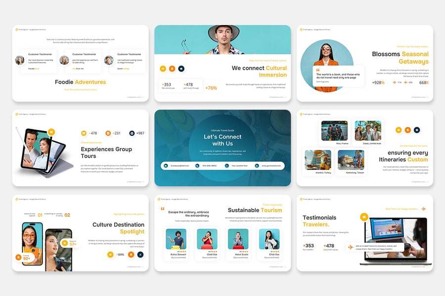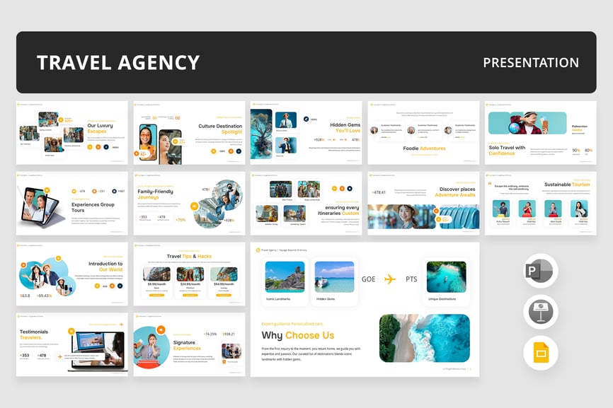 该演示模板不仅视觉上令人惊叹,而且经过精心设计,可以吸引观众,突出您的服务,并最终为您的旅游业务带来更多的销售和预订。