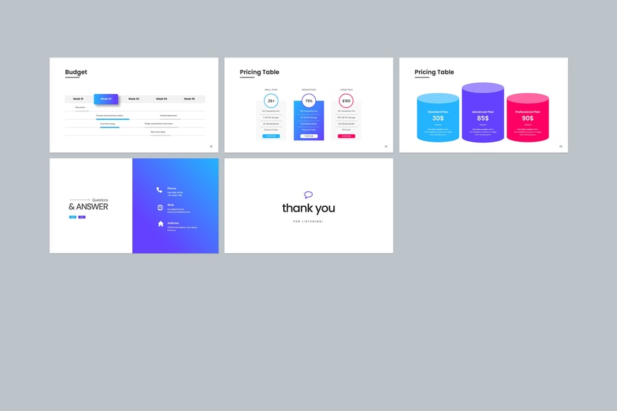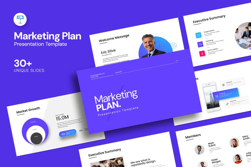 使用营销计划演示模板,以专业简洁的方式展示您的作品。这款模板设计简洁现代,功能强大,包含创意照片布局、信息图表、表格、矢量图标、示意图以及大量实用功能,可将您的作品和公司形象提升到全新高度。