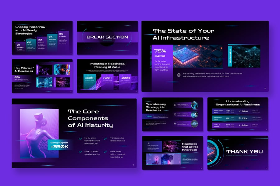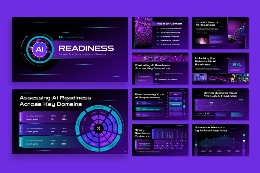是一种创意风格的演示模板,非常适合 AI Readiness、人工智能、技术、现代、系统、项目推介等多种用途。