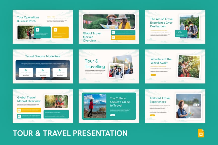对于希望以专业且视觉冲击力强的方式展示服务的旅行社、旅行社运营商、度假规划师和旅游营销人员来说,旅游和旅行 Google 幻灯片演示模板是理想之选。该模板采用简洁、现代且充满冒险精神的美学设计,可帮助您以独特的风格展示目的地、行程、旅行套餐和客户评价。借助完全可编辑的 Google 幻灯片,您可以轻松自定义颜色、图像、字体和布局,以匹配您的品牌。
