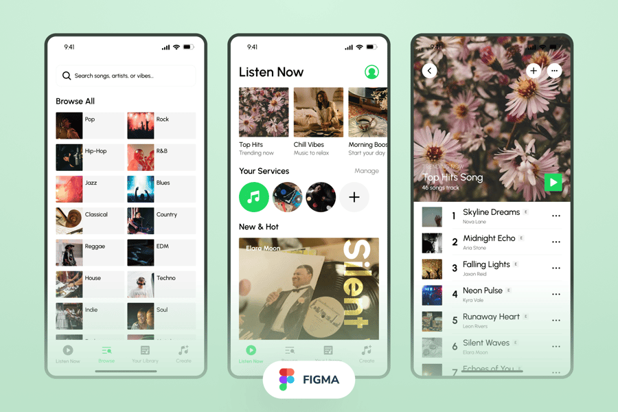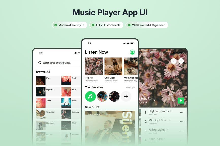 Rylix 是一款专为移动应用打造的现代简约音乐播放器 UI 套件。它采用醒目的字体和简洁的布局,非常适合流媒体平台、播放列表、艺术家页面或播客界面,为用户带来流畅沉浸式的音频体验。