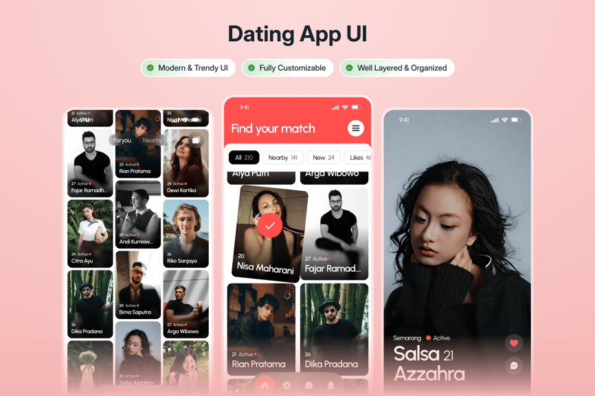 Menira 是一款简洁友好的约会应用 UI 套件,专为移动平台设计。它拥有精心设计的布局、柔和的视觉效果和直观的交互,非常适合打造基于滑动的体验、个人资料发现或消息传递流程。