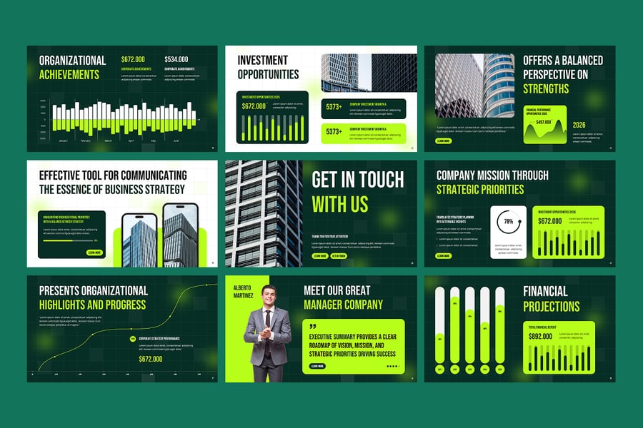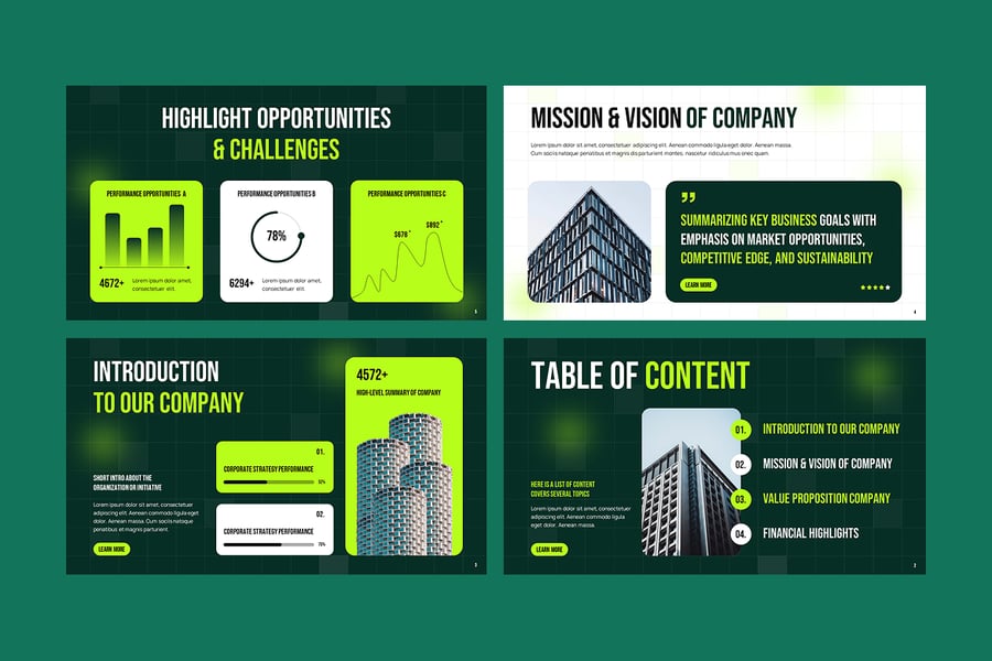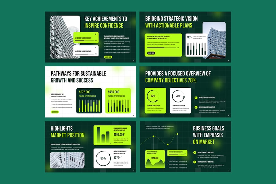 使用“执行摘要”PowerPoint 模板,打造专业且富有影响力的商业演示文稿。此模板专为企业领导者、经理和顾问设计,可帮助您清晰、时尚地展示公司的愿景、目标和业绩。模板拥有简洁现代的幻灯片布局,包含公司概况、使命与愿景、财务亮点、关键指标、SWOT 分析、业务战略和未来路线图。每张幻灯片均可完全自定义,因此您可以轻松调整颜色、字体、图表和信息图,以匹配您的品牌形象。