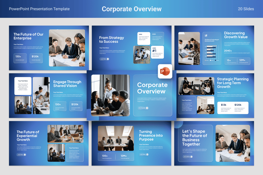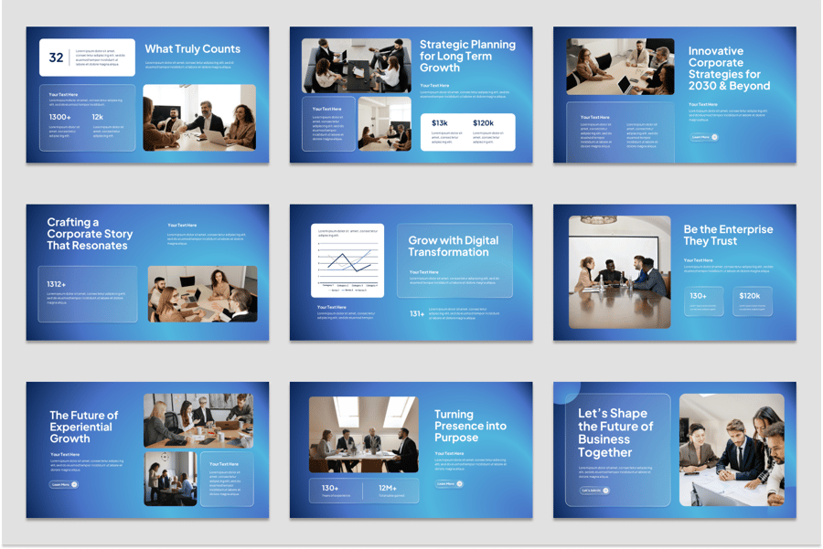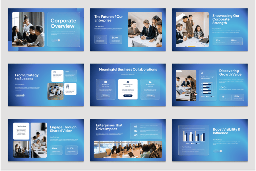 **用例** 公司介绍演示、公司简介、投资者关系会议、业务合作提案、客户参与演示、年度公司报告、领导力和团队介绍、战略规划演示、品牌故事讲述演示、利益相关者参与简报、特许经营机会演示、企业公关和营销演示、并购概述、业务发展会议、愿景和使命展示、产品和服务组合、新员工入职、国际扩张推介、企业活动演示、治理与合规演示