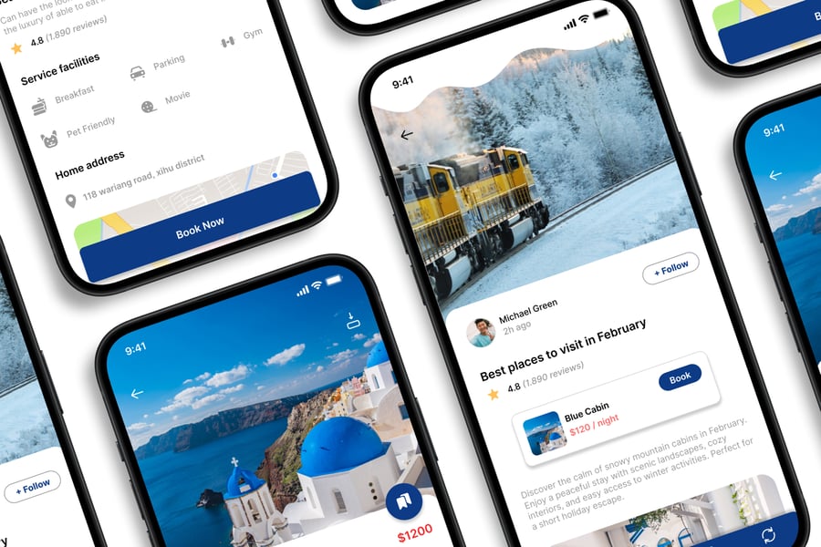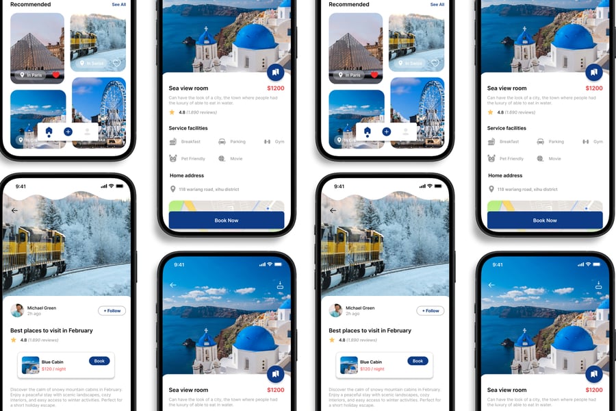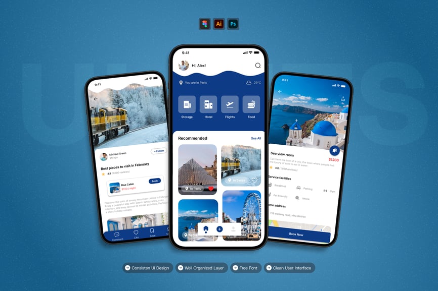 隆重推出**旅行预订**移动应用 UI 套件,这是一款现代化且功能丰富的解决方案,可用于创建简洁、用户友好的应用界面。对于希望加快设计流程的设计师和开发者来说,这款 UI 套件完美契合,它在一个有序的软件包中提供了所需的所有基本组件。
