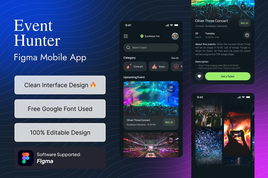 Event Hunter Figma 移动应用程序模板是一款现代、简洁且可自定义的 UI 套件,专为活动发现、票务预订和活动管理应用程序而设计。该模板基于 Figma 的自动布局和井然有序的图层构建,可帮助设计人员和开发人员快速创建用于音乐会、会议、节日和社区活动的用户友好型移动应用程序。