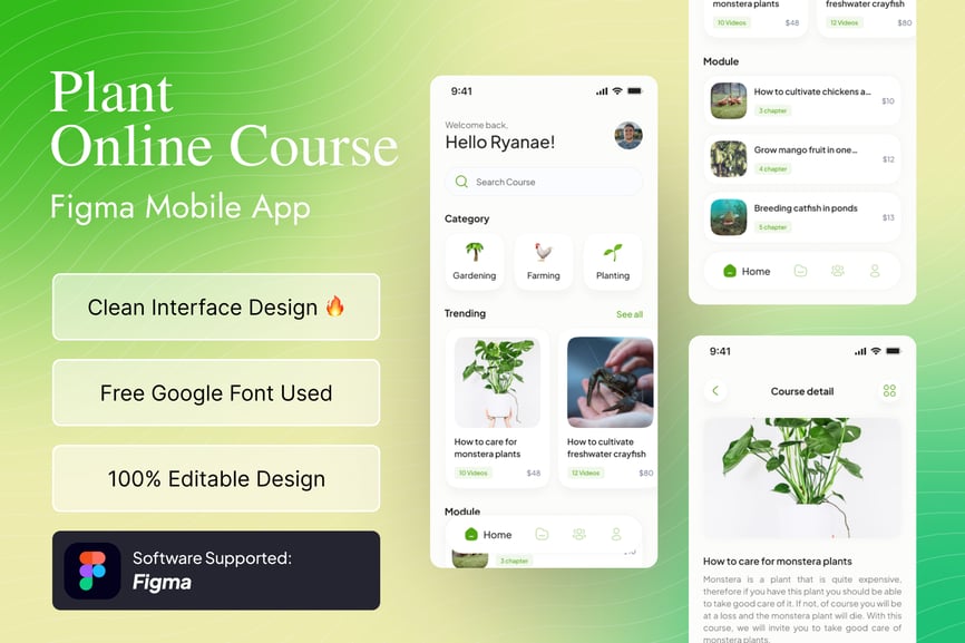 植物在线课程 Figma 移动应用模板是一款现代化且用户友好的 UI 套件,专为专注于植物护理、园艺和可持续性教育的电子学习平台设计。该模板专为 Figma 构建,具有简洁的布局、可扩展的组件和直观的导航,可轻松为在线课程、教程和教育社区设计移动应用程序。