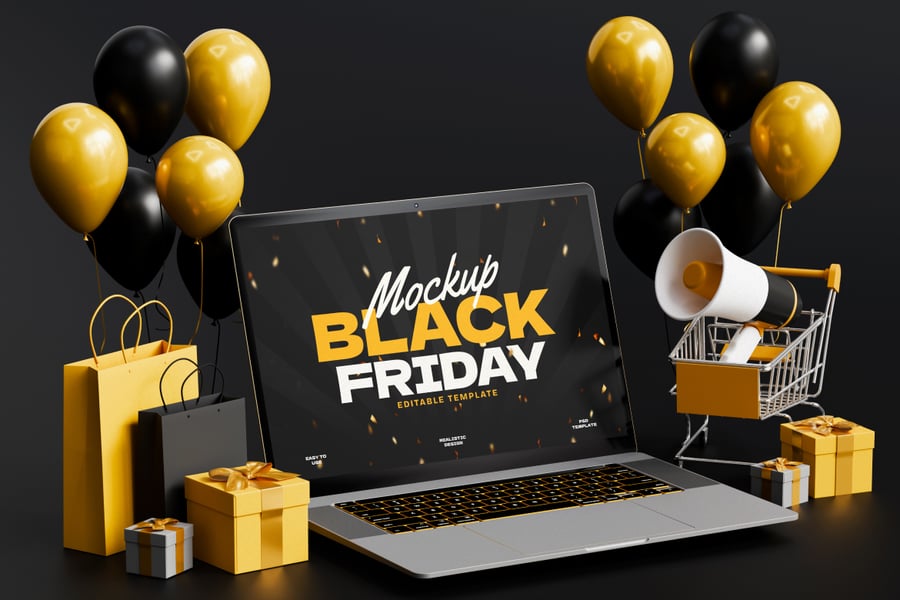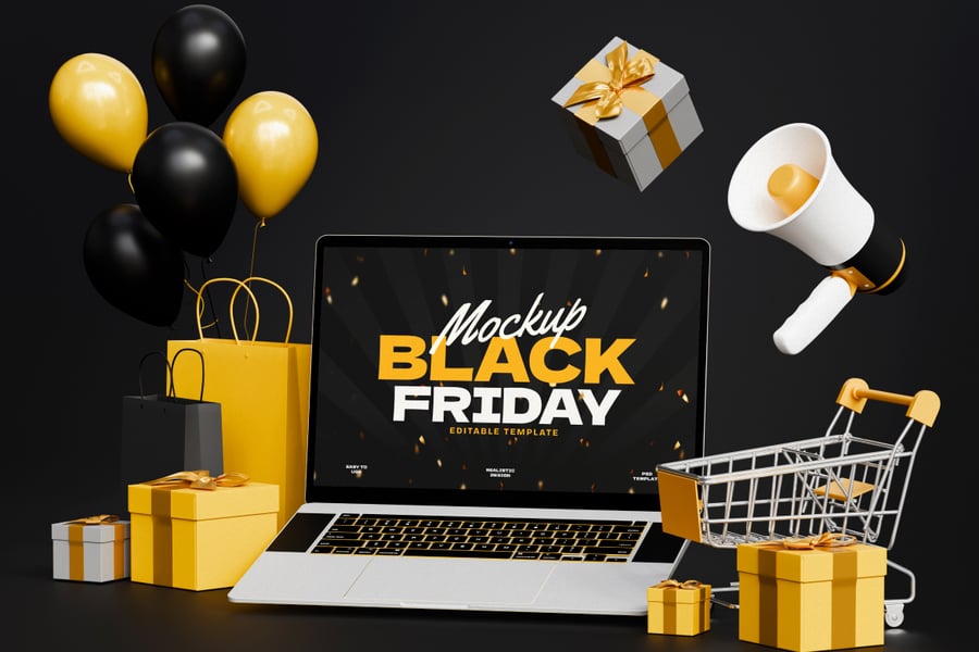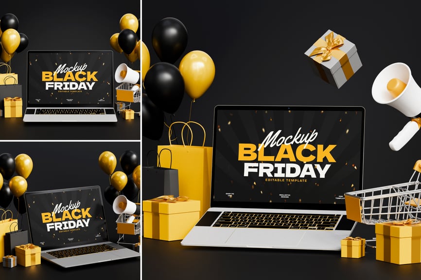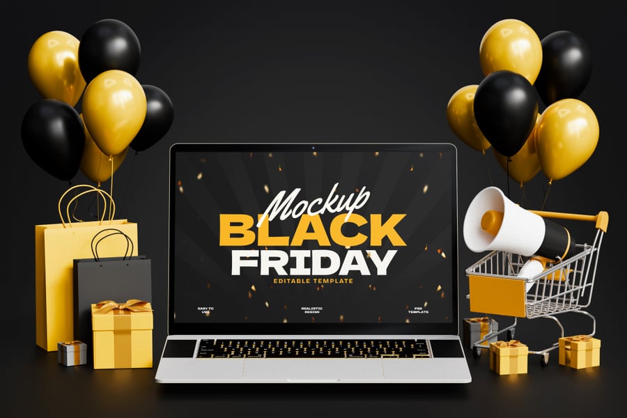 使用这款高质量的黑色星期五笔记本电脑模型来展示您的黑色星期五促销和电商活动。这款模型非常适合营销人员、设计师和网店店主,它包含智能对象图层、完全可编辑的 PSD 文件以及包含购物袋、气球、礼品盒和扩音器的逼真 3D 设置。您可以轻松自定义笔记本电脑屏幕、背景和道具,为您的数字和印刷广告活动打造专业、引人注目的演示文稿。非常适合用于社交媒体帖子、网店、营销演示和作品集展示。