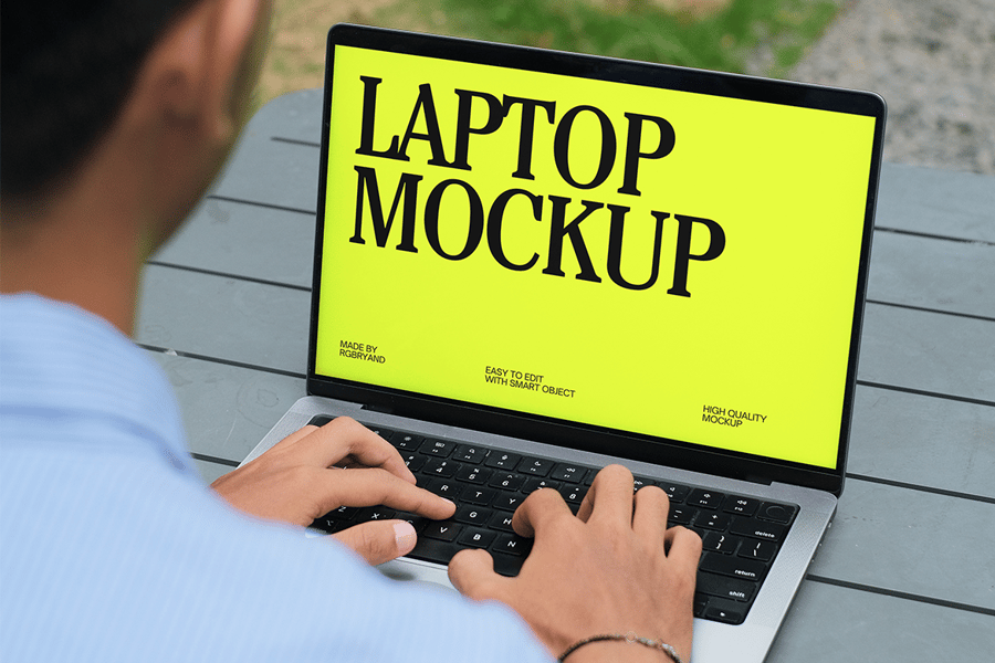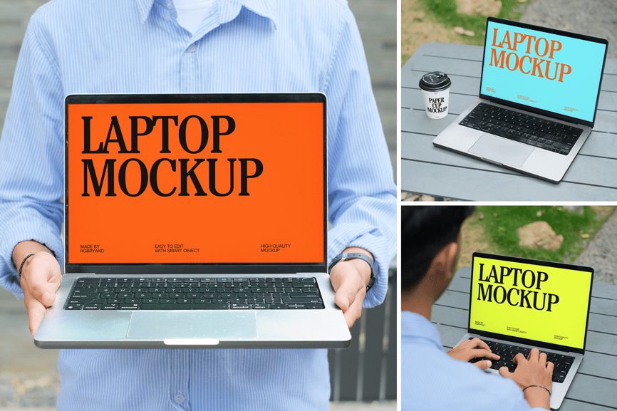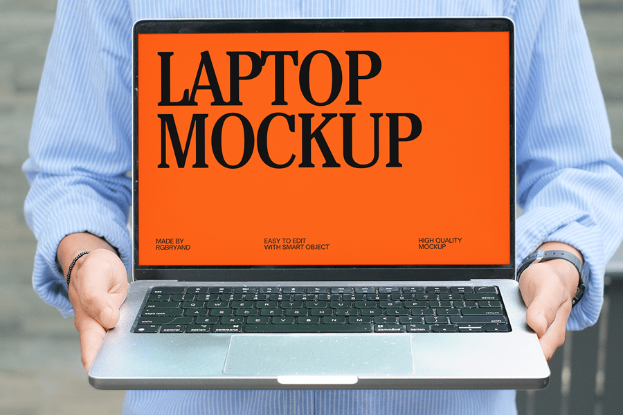 **笔记本电脑样机**。这款现代笔记本电脑样机模板展示了一个逼真的工作空间设置,其中一个人在各种户外和桌面场景中手持并使用笔记本电脑。该模板非常适合展示网站设计、品牌项目或用户界面预览。凭借高分辨率细节和可编辑的智能对象,您可以轻松插入自己的视觉效果并自定义颜色,打造专业的演示效果。非常适合设计师、营销人员和数字产品展示。