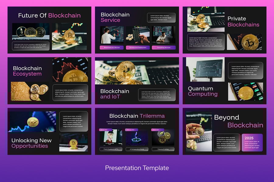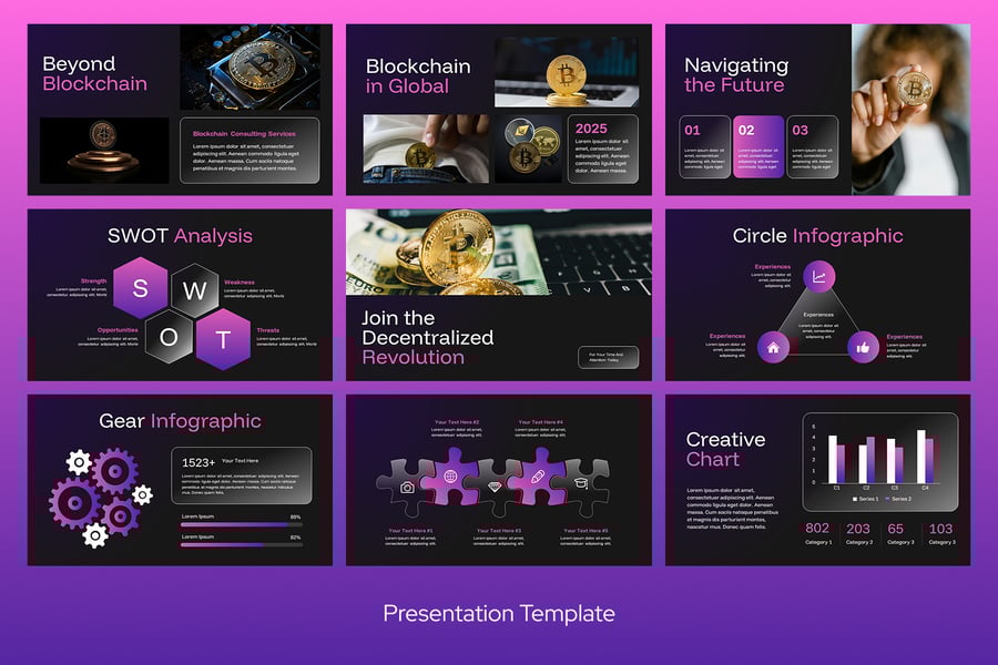 此模板非常适合金融科技初创公司、区块链开发者、加密货币投资者、教育工作者以及想要讲解区块链解决方案的顾问。您可以将其用于投资推介、区块链研讨会、加密货币项目报告、金融科技创新会议以及数字经济演示,以展示投资机会并提升参与度。