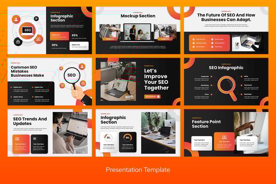 月度 SEO 绩效报告、客户 SEO 演示、数字营销策略演示文稿、网站流量分析、搜索排名概览、反向链接报告演示文稿、关键词研究演示文稿、竞争对手 SEO 报告、转化跟踪幻灯片、SEO 活动回顾、增长策略报告、营销团队更新、数字绩效仪表板、网站优化提案、在线可见性演示文稿、内容 SEO 分析、有机搜索增长报告、网站审计演示文稿、电子商务 SEO 回顾、营销投资回报率报告