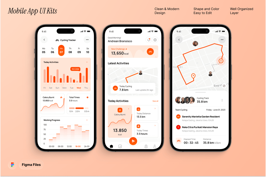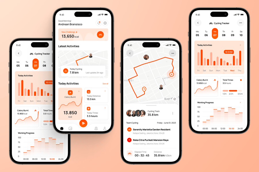这是一款专为骑行者和健身爱好者打造的性能驱动型 UI 套件,将 GPS 路线与锻炼洞察相结合。它配备导航、速度监控和距离记录等屏幕,可提供精准的追踪。