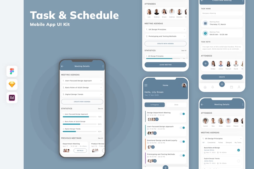 我们的 UI 工具包经过精心设计,可完美适配 Figma、Sketch 和 Adobe XD。所有文件都组织有序,命名规范,因此您可以轻松修改任何设计。