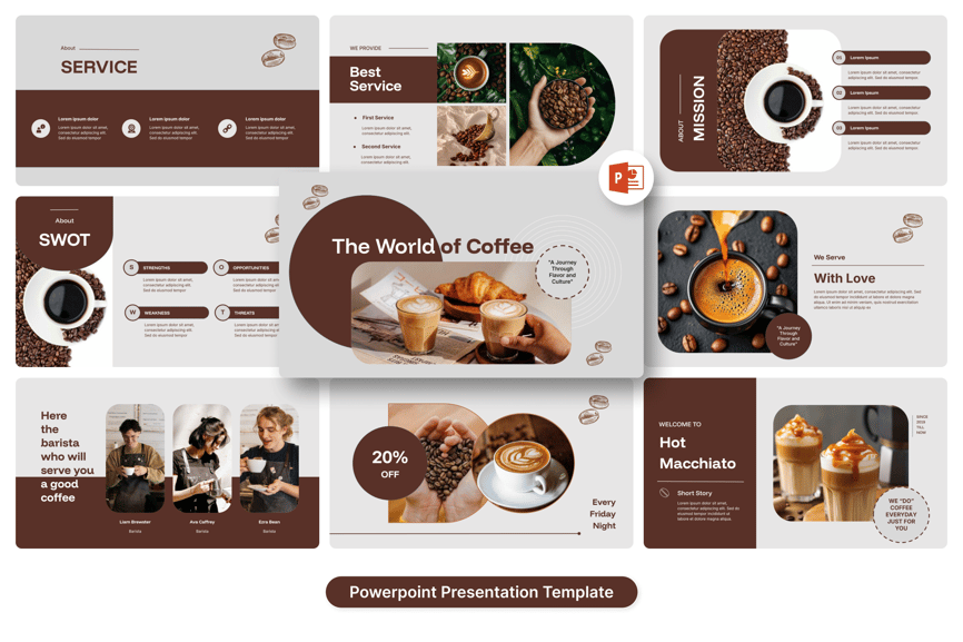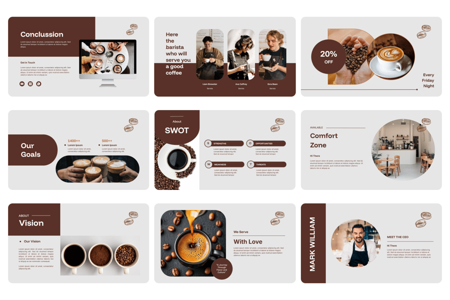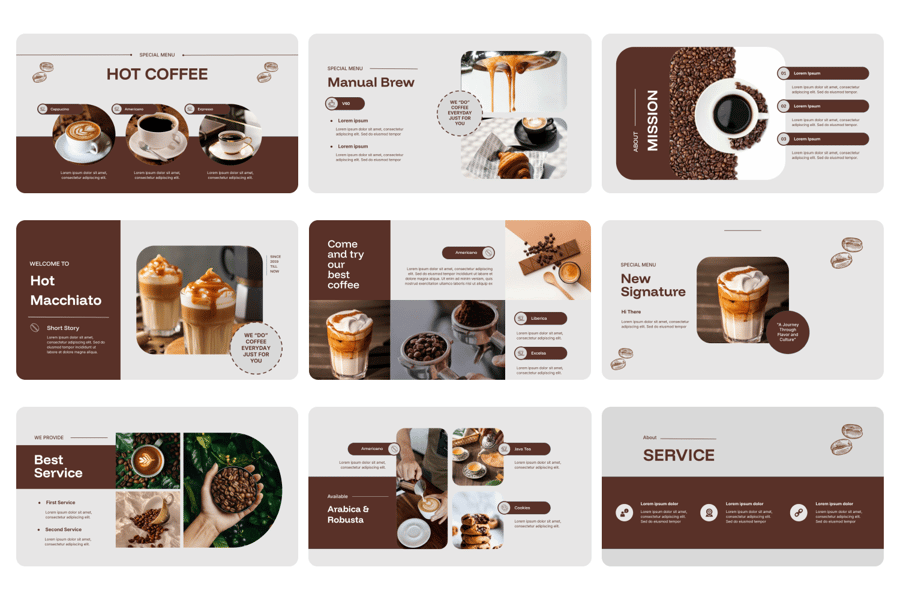 此模板非常适合咖啡店老板、咖啡师、市场营销团队、餐饮顾问以及希望推介商业理念、展示菜单概念或阐述品牌战略的创业者。您可以将其用于商业计划书、咖啡馆品牌推广、营销活动、投资者演示或促销活动,以有效地与您的目标受众建立联系。