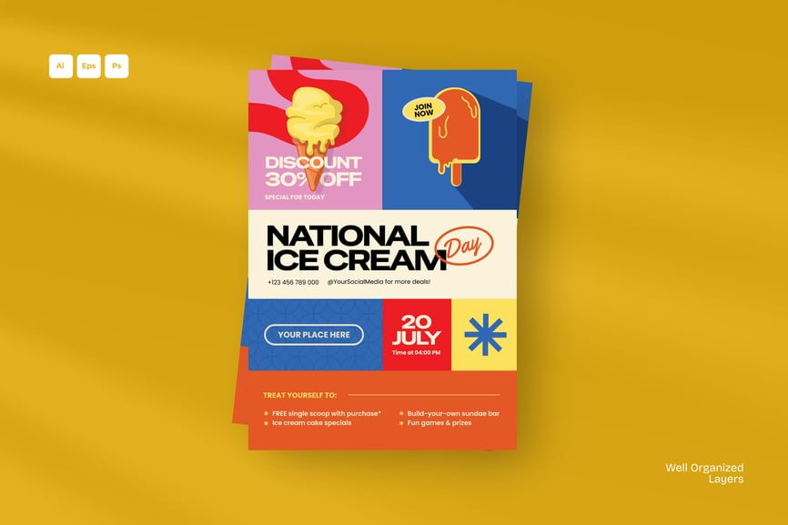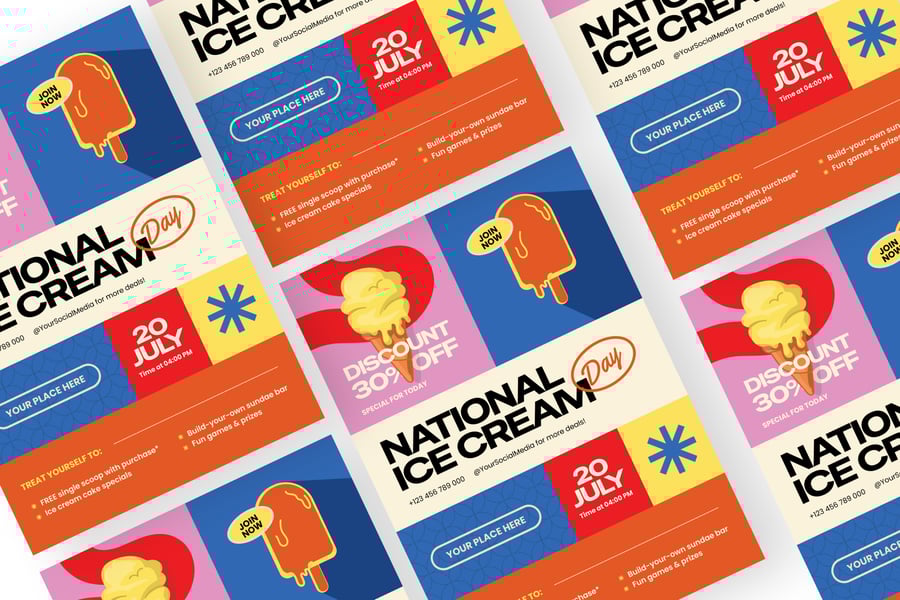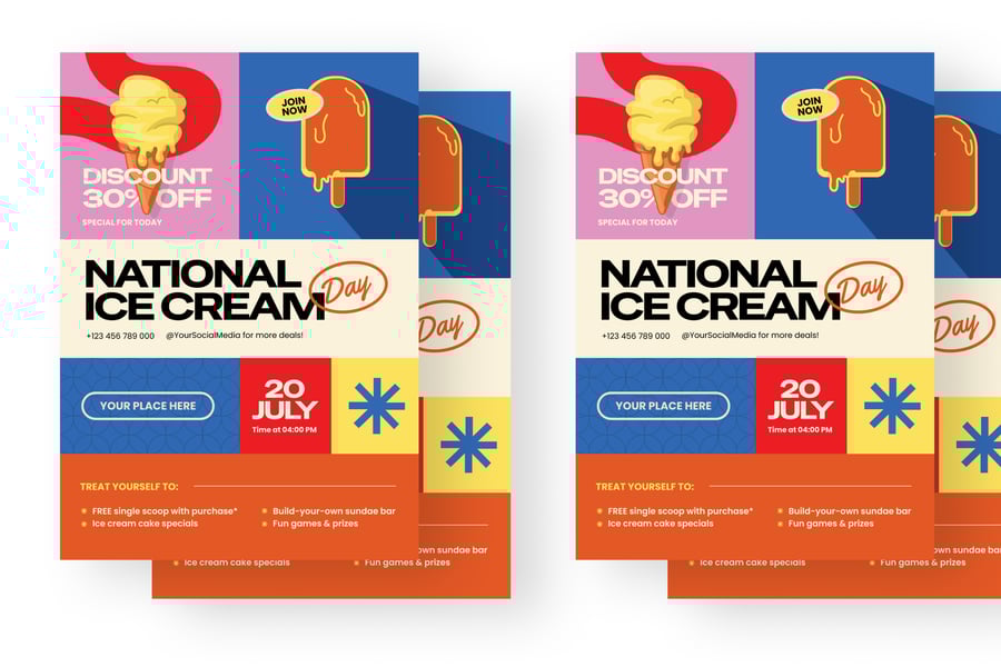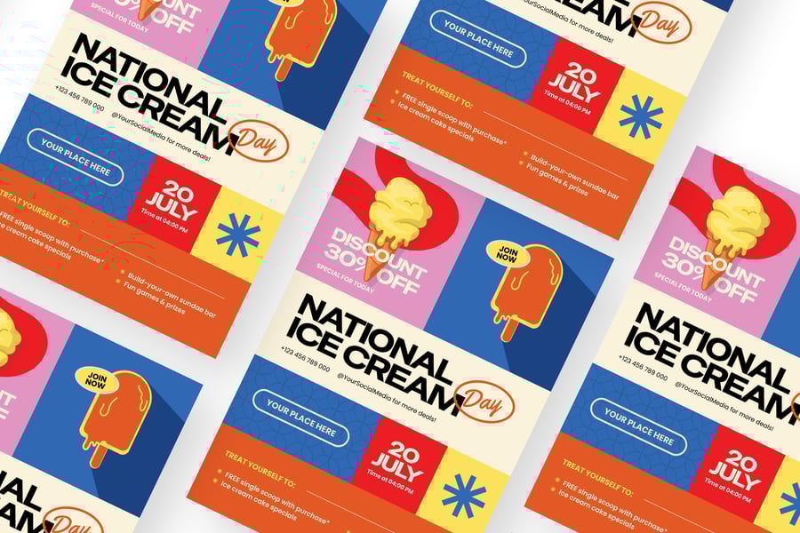 用这款趣味十足、色彩缤纷的国家冰淇淋日传单模板来庆祝一年中最甜蜜的一天。这款传单采用鲜艳的色彩、俏皮的插图和大胆的字体设计,非常适合宣传冰淇淋店活动、特别折扣、夏季节日或美食促销。欢快的布局捕捉了冰淇淋的乐趣和夏日氛围,让您的受众难以抗拒。