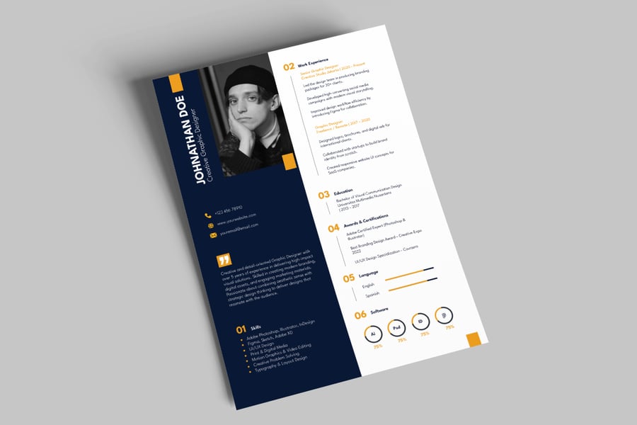 这款简洁、可编辑的简历模板专为希望给人留下自信自信第一印象的专业人士设计,定能给雇主和客户留下深刻印象。无论您是设计师、营销人员、开发人员还是自由职业者,这款简历布局都能在现代美学和专业清晰度之间取得完美平衡。