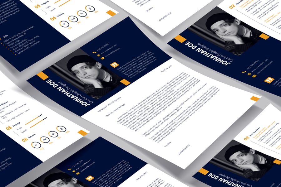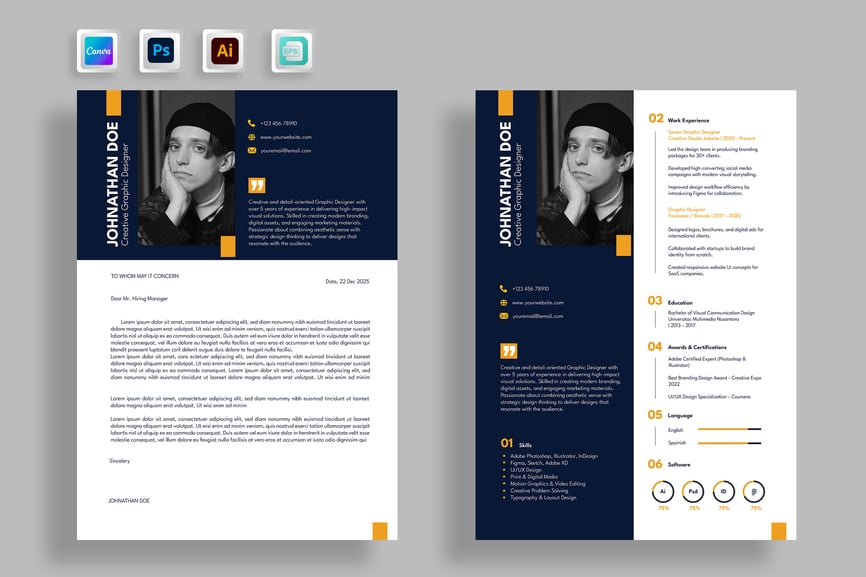 这款简历模板兼顾了影响力和可读性。它结构清晰,版式简洁,空间运用巧妙,能够帮助您以独特的风格展现您的技能、经验和个性。它可在 Adobe Illustrator 和 Photoshop 中轻松自定义,并包含配套的求职信和名片,打造一致且极具影响力的个人品牌。简洁优雅的专业简历非常适合求职申请、个人品牌推广或作品集介绍,是您在竞争激烈的市场中脱颖而出的关键。
