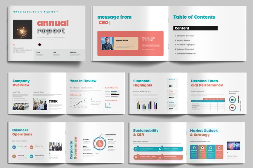 创意商业年度报告模板采用现代且视觉引人入胜的布局,旨在帮助企业以创意的方式呈现财务数据、成就和里程碑。它拥有简洁的网格、醒目的视觉效果和可自定义的版块,兼具专业性与引人注目的设计。此模板非常适合用于印刷版或电子版报告,能够将公司数据转化为引人入胜、易于阅读的叙述。