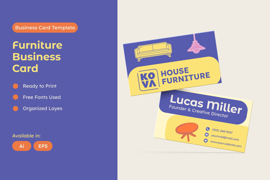 家具名片模板布局大胆时尚,非常适合家具、室内装饰或创意行业的专业人士。简洁的字体、鲜艳的配色方案以及重要的联系方式空间,让您留下深刻印象。该模板提供 AI 和 EPS 格式,完全可定制且可直接打印,非常适合用于社交、客户会议或活动宣传。