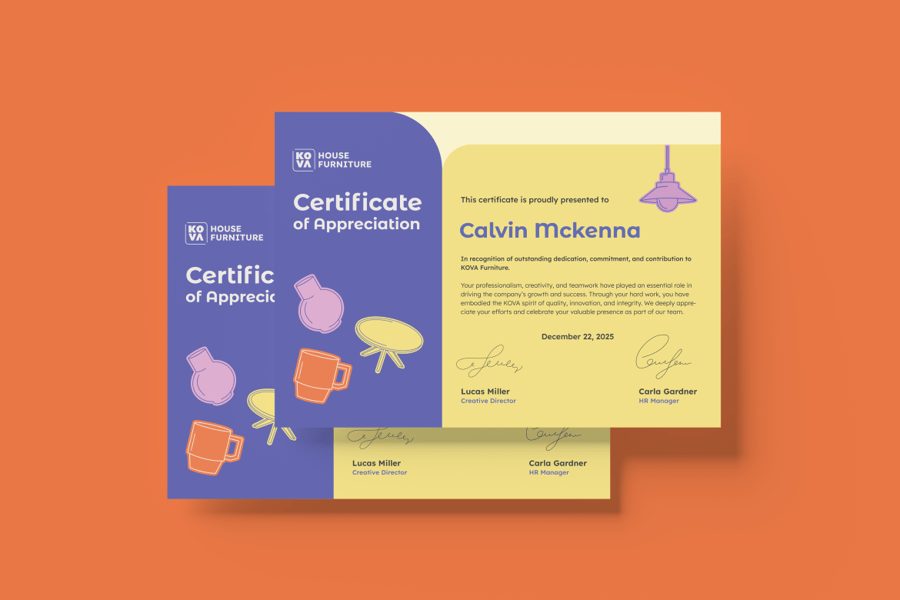 家具证书模板采用充满活力且专业的版式设计,旨在表彰家具行业或创意企业员工的卓越表现、奉献精神或服务。它结构简洁,字体现代,插图色彩鲜艳,与 KOVA 品牌形象相得益彰。该模板支持 AI 和 EPS 格式编辑,可直接打印,完全可定制,适用于正式和创意场合。