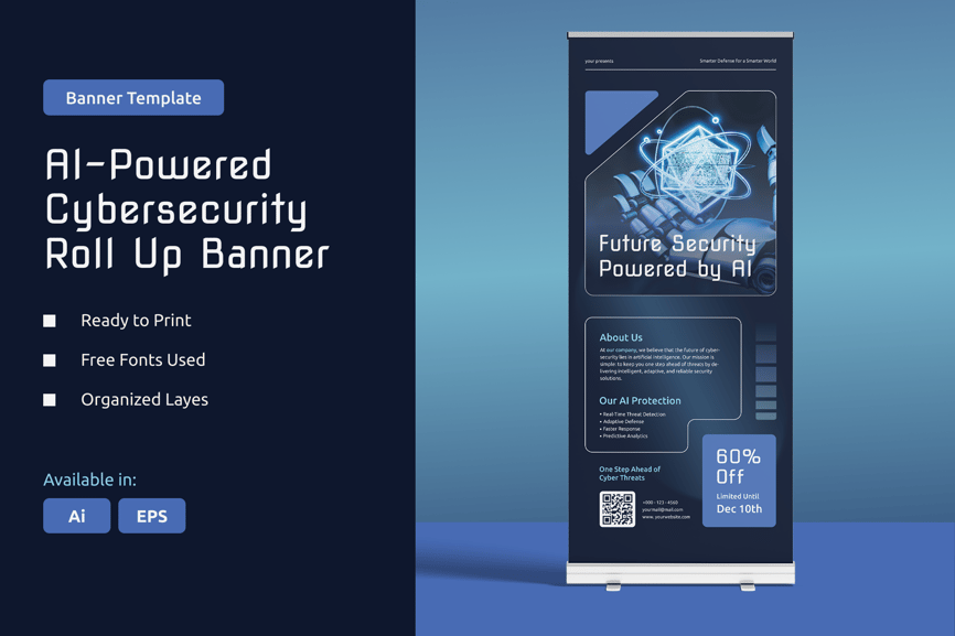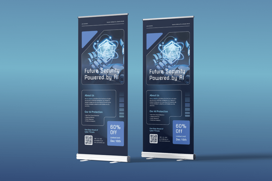 使用这款 AI 驱动的网络安全卷轴横幅模板,展示您的网络安全解决方案和 AI 技术。此模板支持 AI 和 EPS 格式,可完全编辑,您可以自定义文本、图片、徽标和优惠信息,打造专业且引人注目的展示效果。该设计强调数据安全、AI 保护和尖端网络防御,非常适合贸易展览、会议、展览、科技活动或办公室展示。此横幅可直接打印或进行数字改编,确保您的品牌信息脱颖而出,吸引受众注意力。