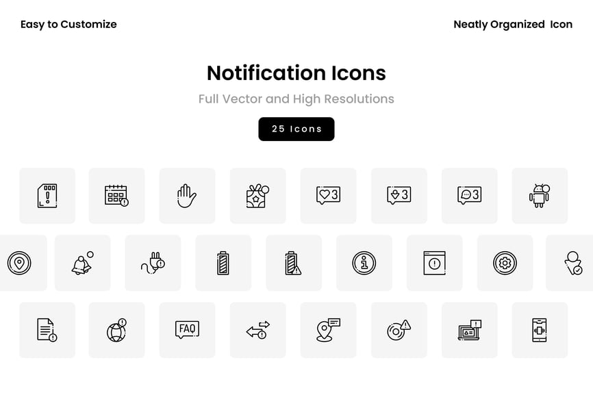 Android、箭头、注意、日历、CD、常见问题、好友请求、电池满电、礼物、信息、位置图钉、电池电量低、消息、未找到、通知、通知、插头、隐私、反应、更新、用户、振动、警告