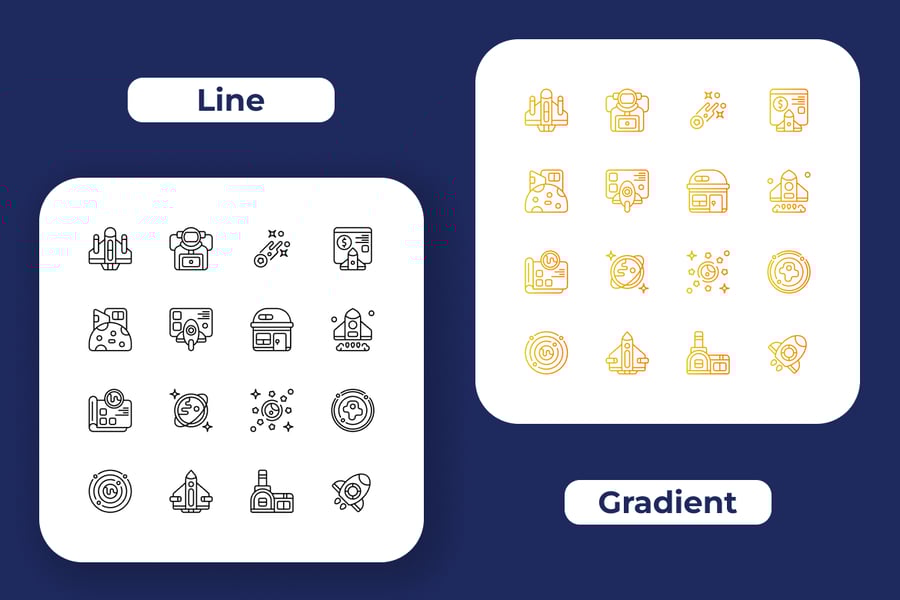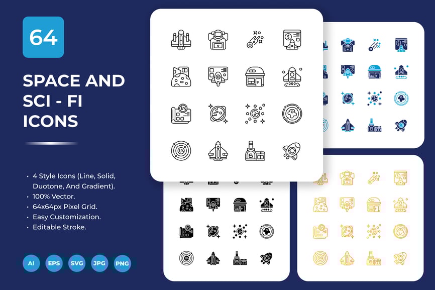 一个现代且功能多样的图标包,专为网站、移动应用、书籍、社交媒体、信息图表、传单、印刷品、横幅、海报等设计。包含 64 个图标,涵盖 4 种风格:**线条、实心、双色调和渐变**。