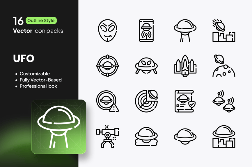 这套充满未来感的UFO图标集,带你揭开宇宙神秘的魅力。它包含16个轮廓风格的矢量图标,涵盖飞碟、地外生物遭遇、绑架、卫星和宇宙现象等主题。
