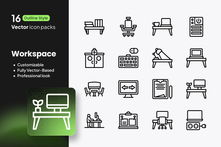 这套现代风格的工作区图标集,助您提升工作效率和创造力。它包含 16 个轮廓风格的矢量图标,涵盖了办公室和远程工作环境中的关键元素,例如办公桌、笔记本电脑、文具、协作工具等等。