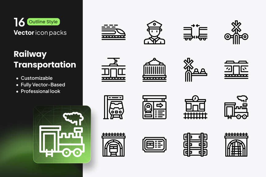这套精心制作的铁路运输图标集包含十六个精心设计的矢量图标,助您打造流畅的旅行体验。该系列涵盖列车、轨道、车站、车票、信号和货物,提供专业的铁路和物流系统呈现方式。