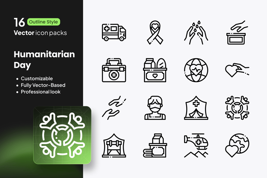 这套精心设计的“世界人道主义日”图标集,旨在颂扬同情心和全球团结。该图标集包含 16 个简洁的轮廓风格矢量图标,突出了慈善、友善、医疗援助、社区支持和志愿服务等关键主题。