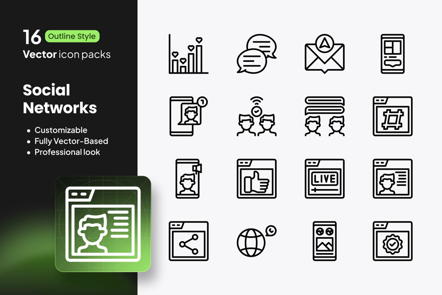 这套现代社交网络图标集包含十六个轮廓风格的矢量图标,助您建立并培养联系。该系列涵盖聊天气泡、用户资料、关注者、点赞、分享和消息传递元素,非常适合以应用程序、网站、营销活动或社区平台为中心的项目。
