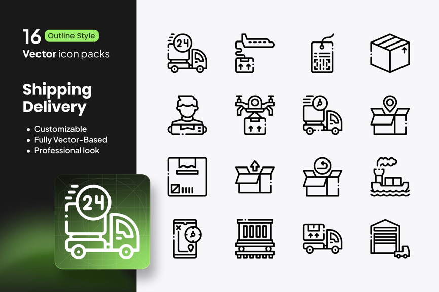 这些图标对于电子商务平台、快递服务、物流公司、移动应用程序、网站和商业演示至关重要,有助于清晰、准确地可视化交付操作。