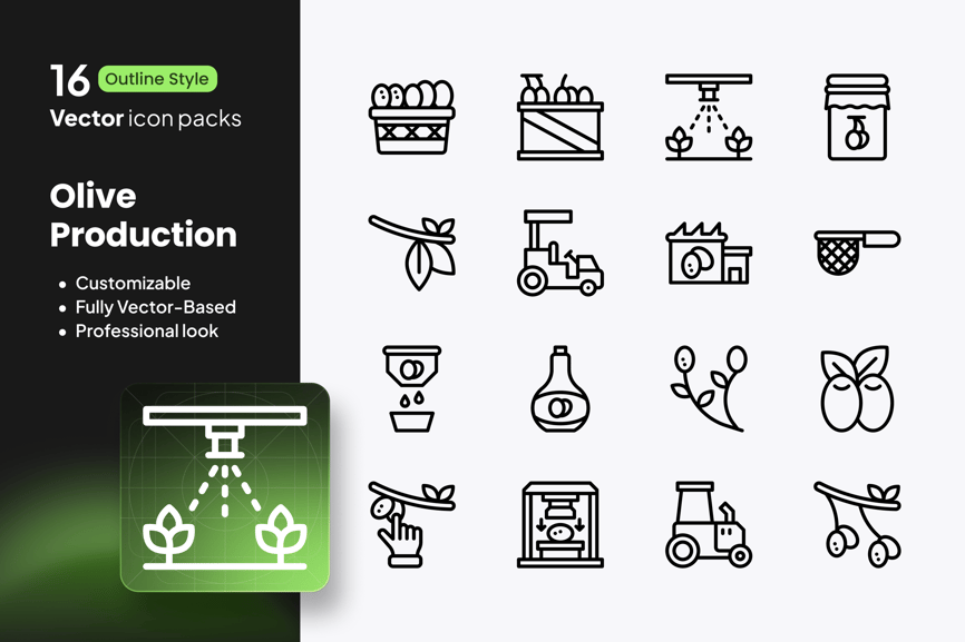 这套精心制作的橄榄生产图标集包含 16 个精心设计的矢量图标,旨在强调传统和农业的重要性。该系列精美地展示了橄榄枝、油瓶、收割工具、农场和加工设备,使其成为食品品牌推广、农业活动、教育材料或文化设计项目的理想资源。