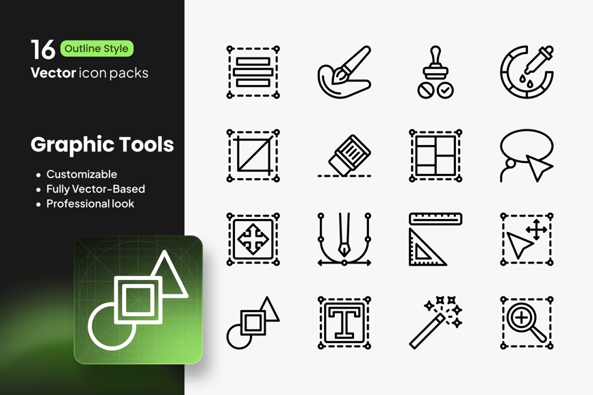 这些图标采用 64×64px 网格设计,笔触精确到 2px,可扩展、可自定义,且完全基于矢量。其简洁专业的美感使其成为数字和印刷项目中展示图形设计工具的绝佳选择。
