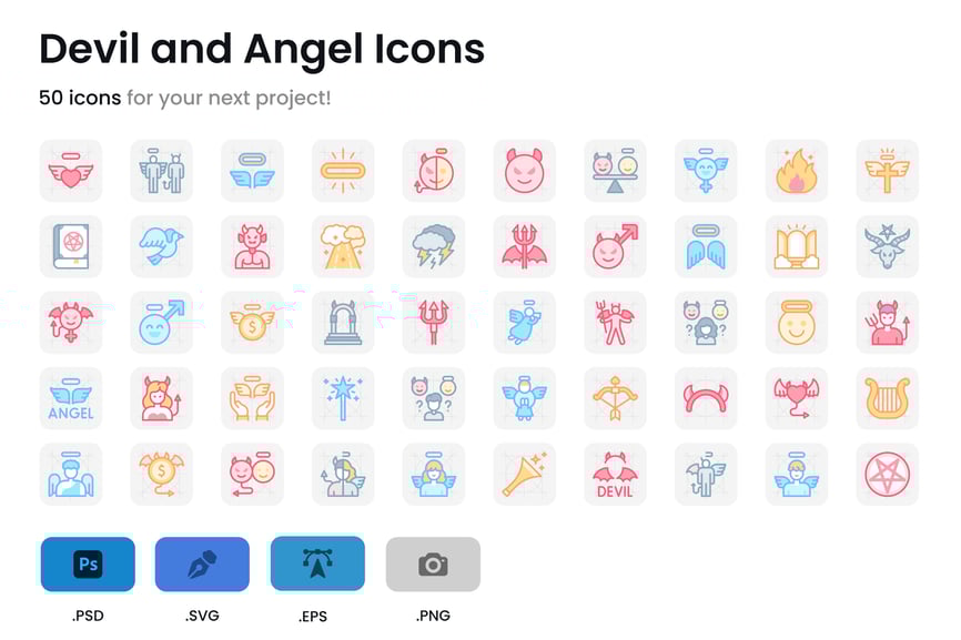 天使、天使与魔鬼、平衡、巴风特、选择、丘比特、魔鬼、鸽子、号角、火焰、光环、竖琴、天堂、地狱、号角、闪电、魔杖、五芒星、魔法书、三叉戟