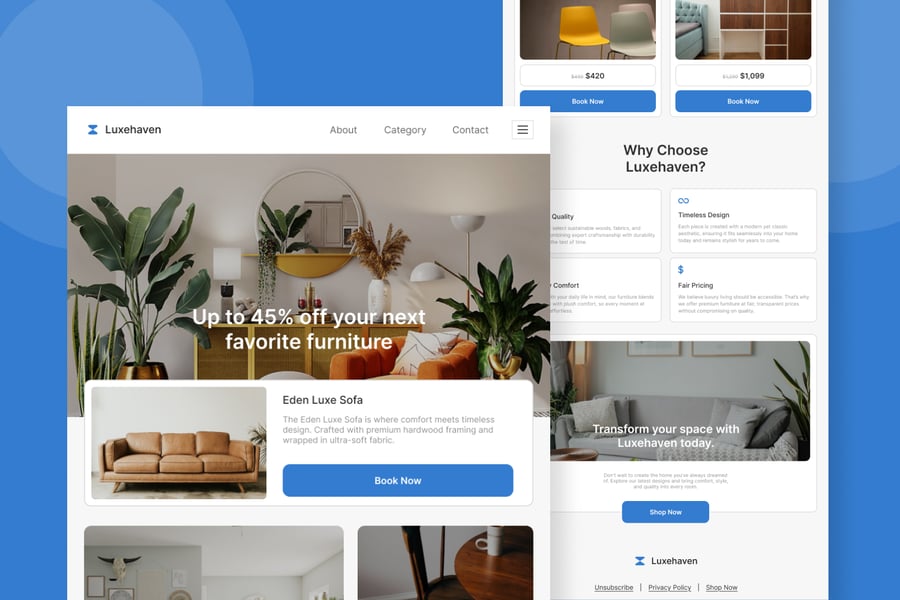 一款简洁优雅的网站用户界面,专为现代电商平台设计。此网页模板采用极简布局,产品列表页面、促销横幅和行动号召区域均针对用户体验进行了优化。非常适合设计师和开发者创建在线家具、室内设计或生活方式产品网站。设计重点在于易用性、美观性和响应式设计。