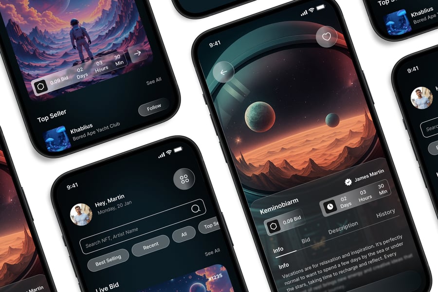 隆重推出 **NFT Market** 移动应用 UI 套件,这是一款现代化且功能全面的解决方案,可助您创建简洁易用的应用界面。对于希望加快设计流程的设计师和开发者而言,这款 UI 套件堪称完美之选,它将您所需的所有基本组件整合在一个井然有序的软件包中。