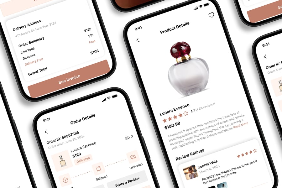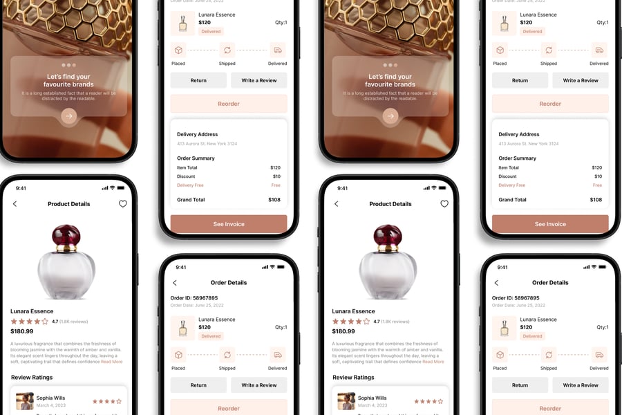 **香水商店** UI 套件的设计重点在于易用性和一致性,让您轻松创建美观实用的移动应用程序。每个元素都经过精心构建,完全可定制,并可根据您的品牌进行调整。无论您是设计社交应用、电商应用还是效率工具,此套件都能让您灵活地将创意变为现实。
