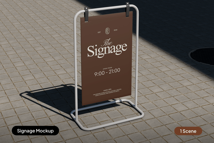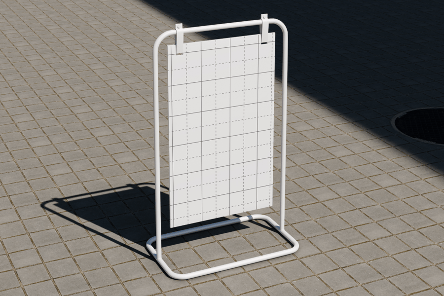 该模型以一个独立的A字形广告牌为中心,它是场景的视觉焦点。广告牌框架采用光滑圆润的金属管材(颜色可编辑),呈现出简洁现代的外观。广告牌面板采用哑光无反光表面,可清晰展示定制图形。由于其与周围环境的巧妙融合,整个场景高度逼真。广告牌直接放置在户外地面上:由方形混凝土或石材地砖铺成的纹理路面。