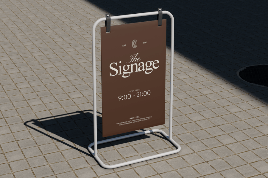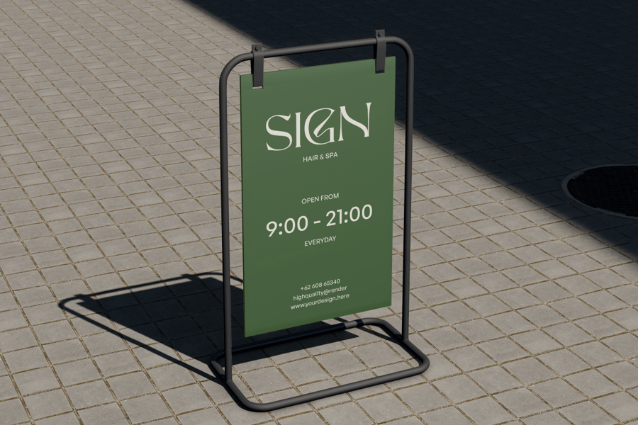 – 逼真的户外场景,包含一个与人行道背景融为一体的 A 字形落地广告牌。